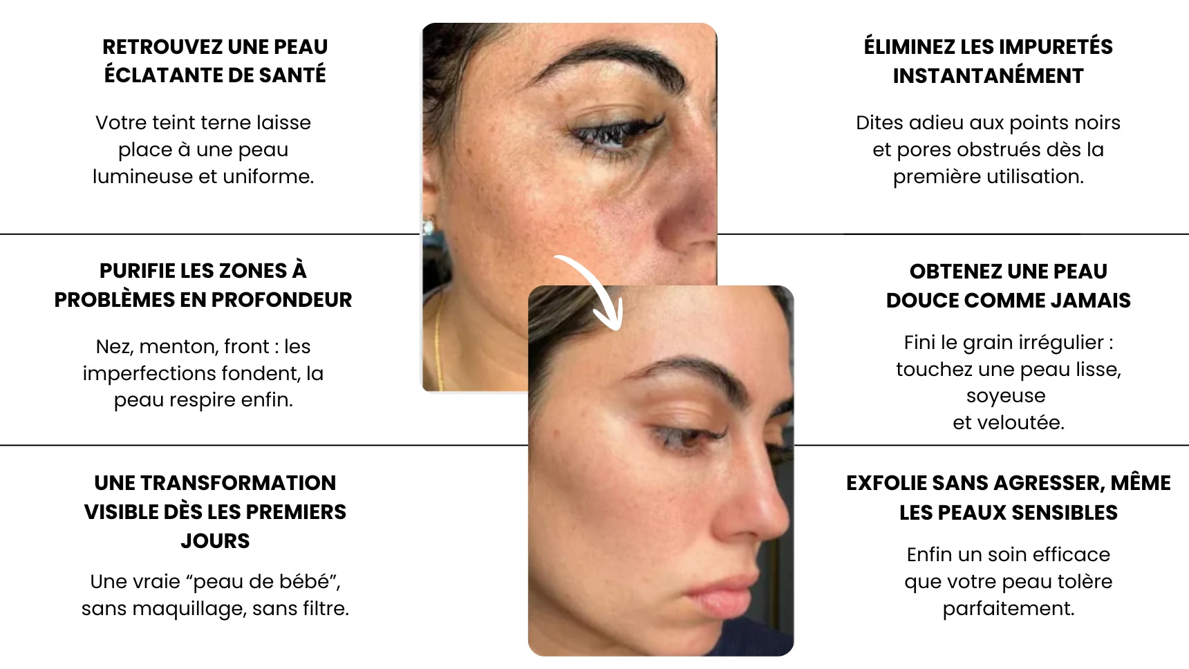 Votre peau paraît plus nette, plus lisse, plus lumineuse — comme fraîchement purifiée.